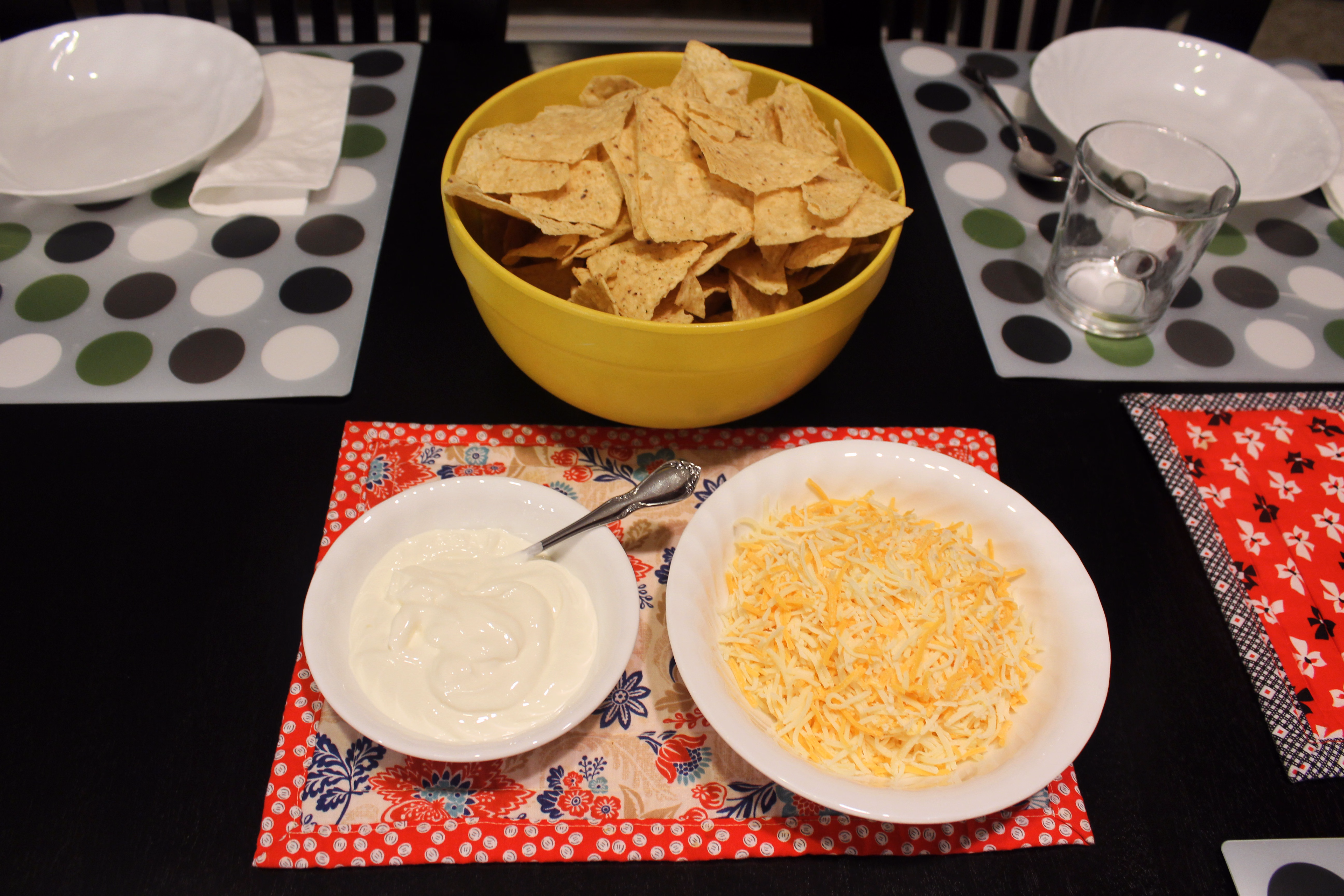 Shredded Mexican-style cheese, sour cream, and tortilla chips for serving