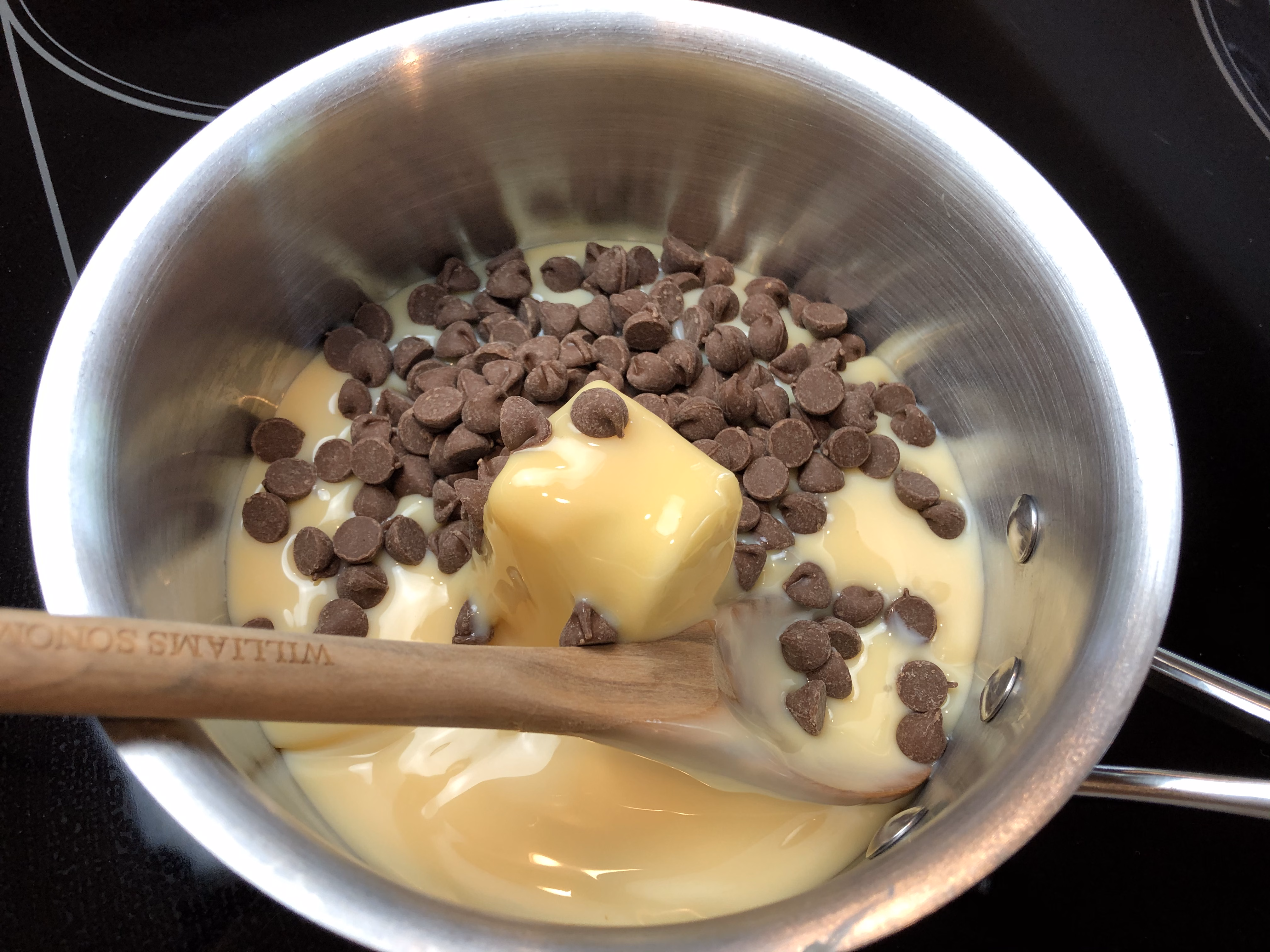 Gather your ingredients. You will need 1/4 cup butter, a can of sweetened condensed milk, and chocolate chips of choice. We mix this up depending on our mood. We love it made with dark, semi-sweet, or milk chips. You can also include a flavoring, if desired.