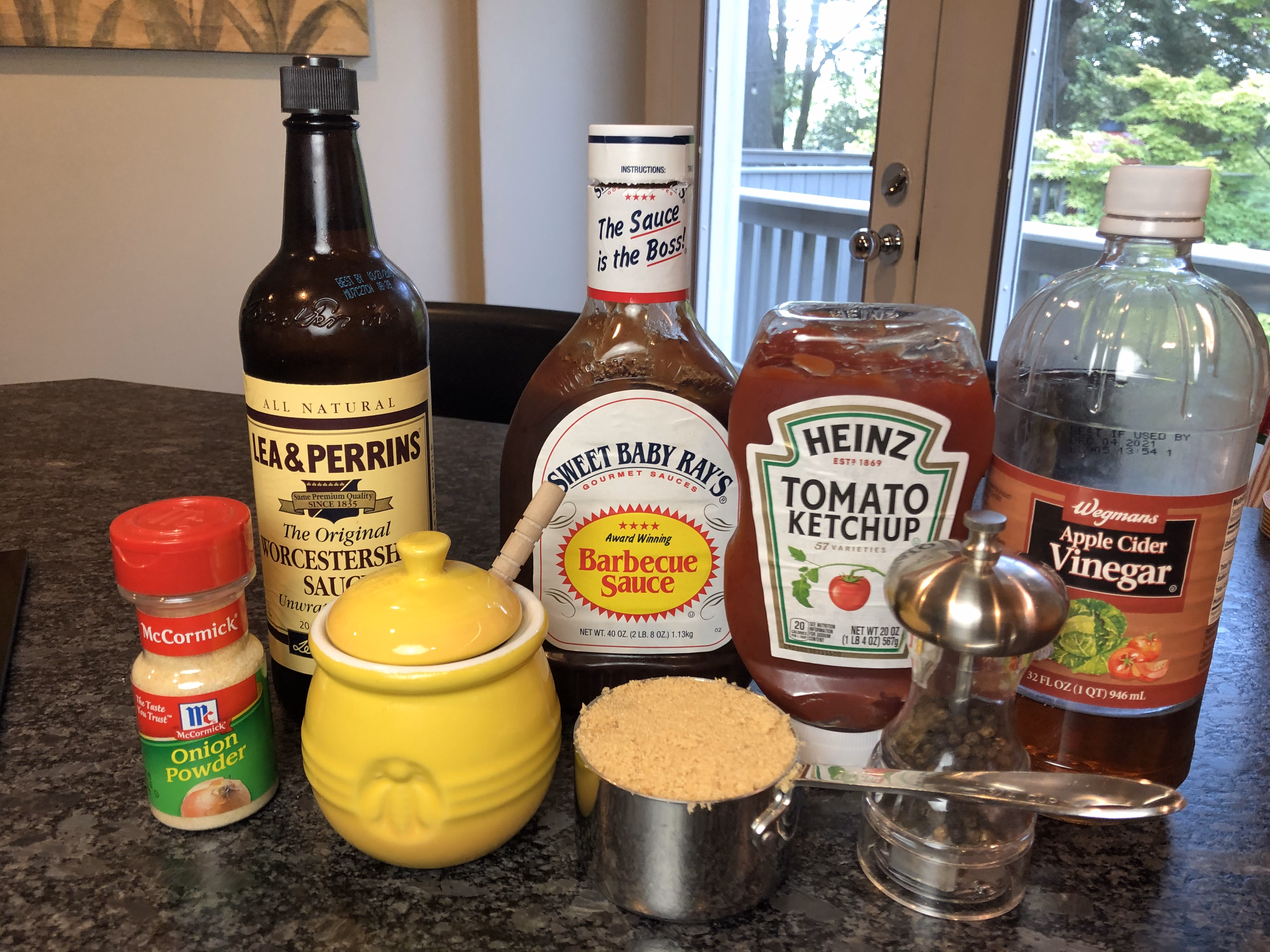 Gather your ingredients. You will need ketchup, brown sugar, BBQ sauce, honey, cider vinegar, Worcestershire sauce, onion powder, and black pepper.