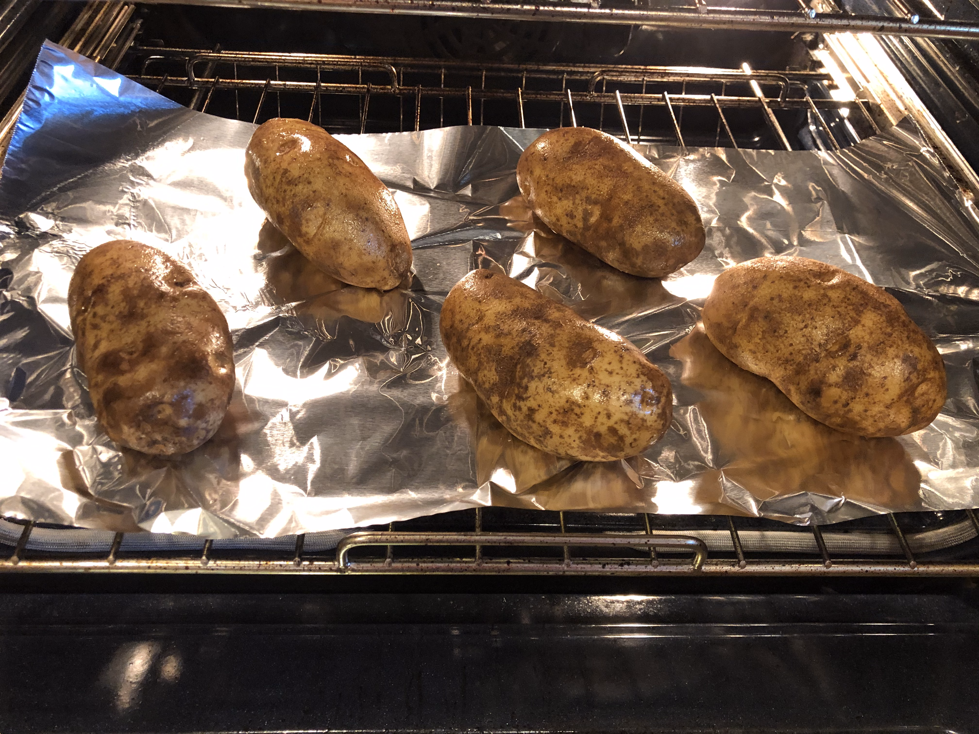 Preheat your oven to 400°F. Pour a little oil into your palm and rub it onto the potatoes, adding more oil as needed. I like to put a piece of foil on the oven rack to keep my oven clean, then place the potatoes on that and bake for 1 hour.