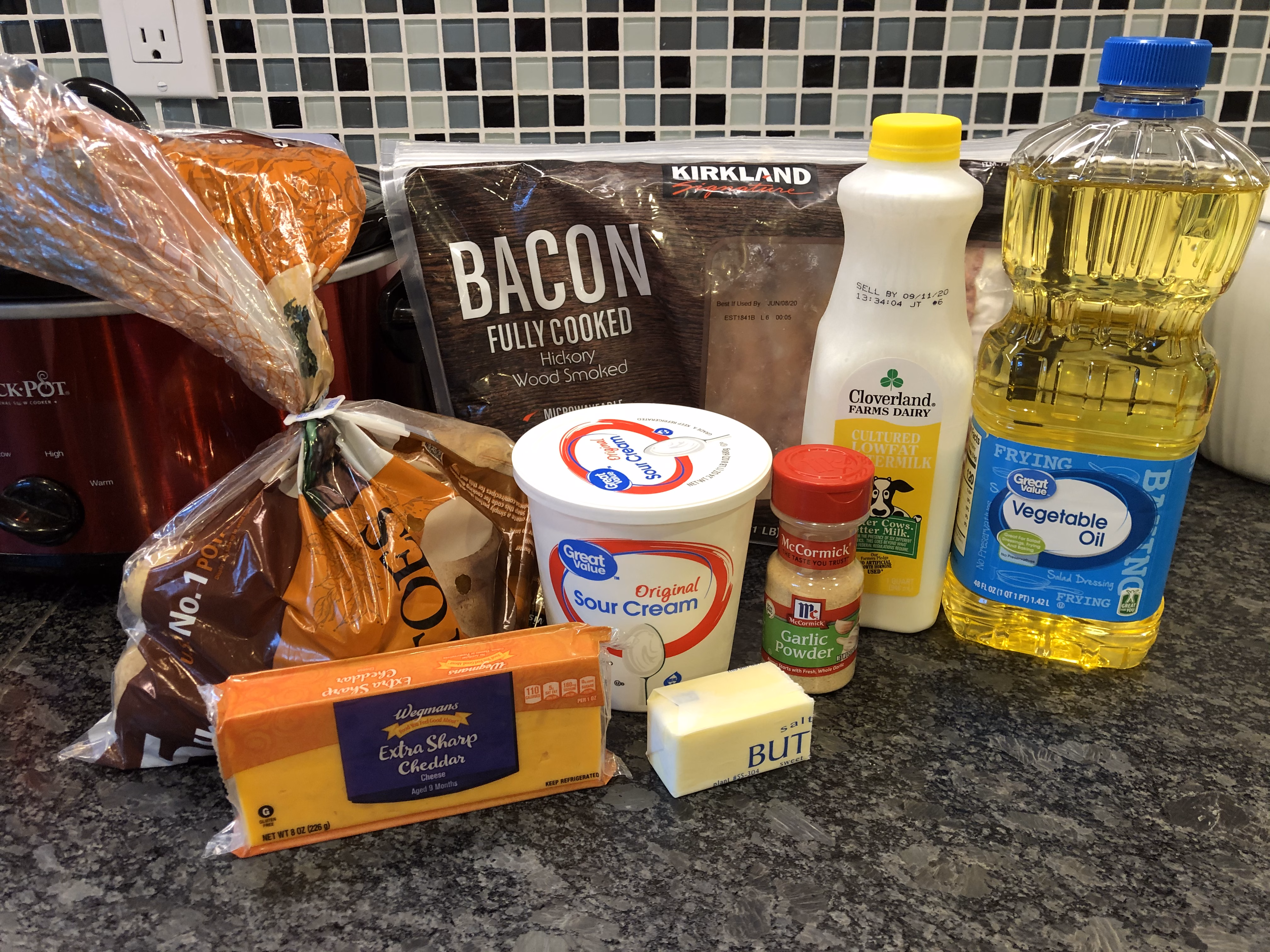 Gather your ingredients. You will need oil, russet potatoes, butter, sour cream, buttermilk, garlic powder, salt and pepper, bacon, and cheddar cheese.