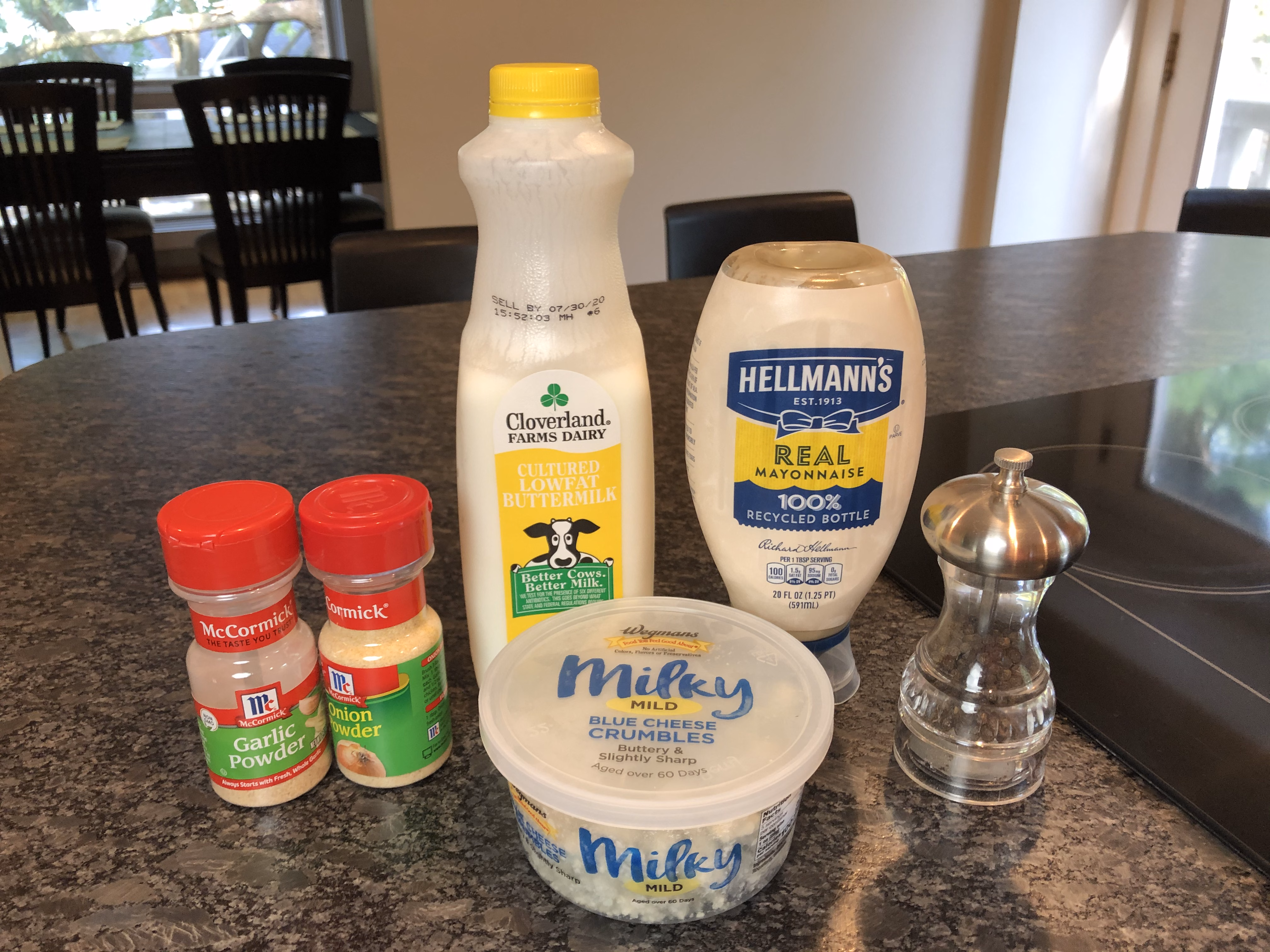 Gather your dressing ingredients. You will need mayonnaise, buttermilk, blue cheese crumbles, garlic powder, onion powder, and freshly ground pepper.