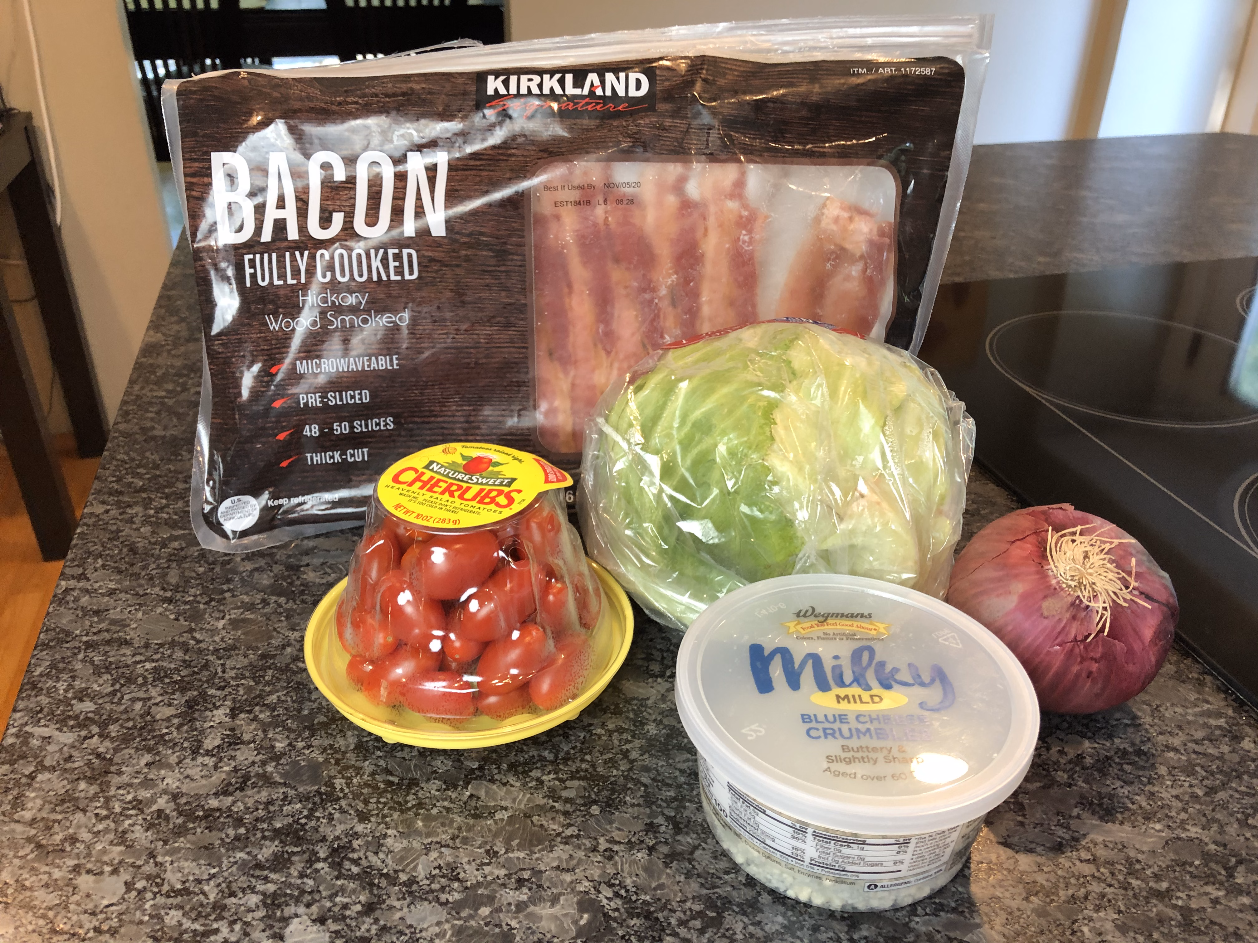 For the salad, cook about 5-6 slices of bacon until crisp, then crumble. Slice tomatoes and red onion.