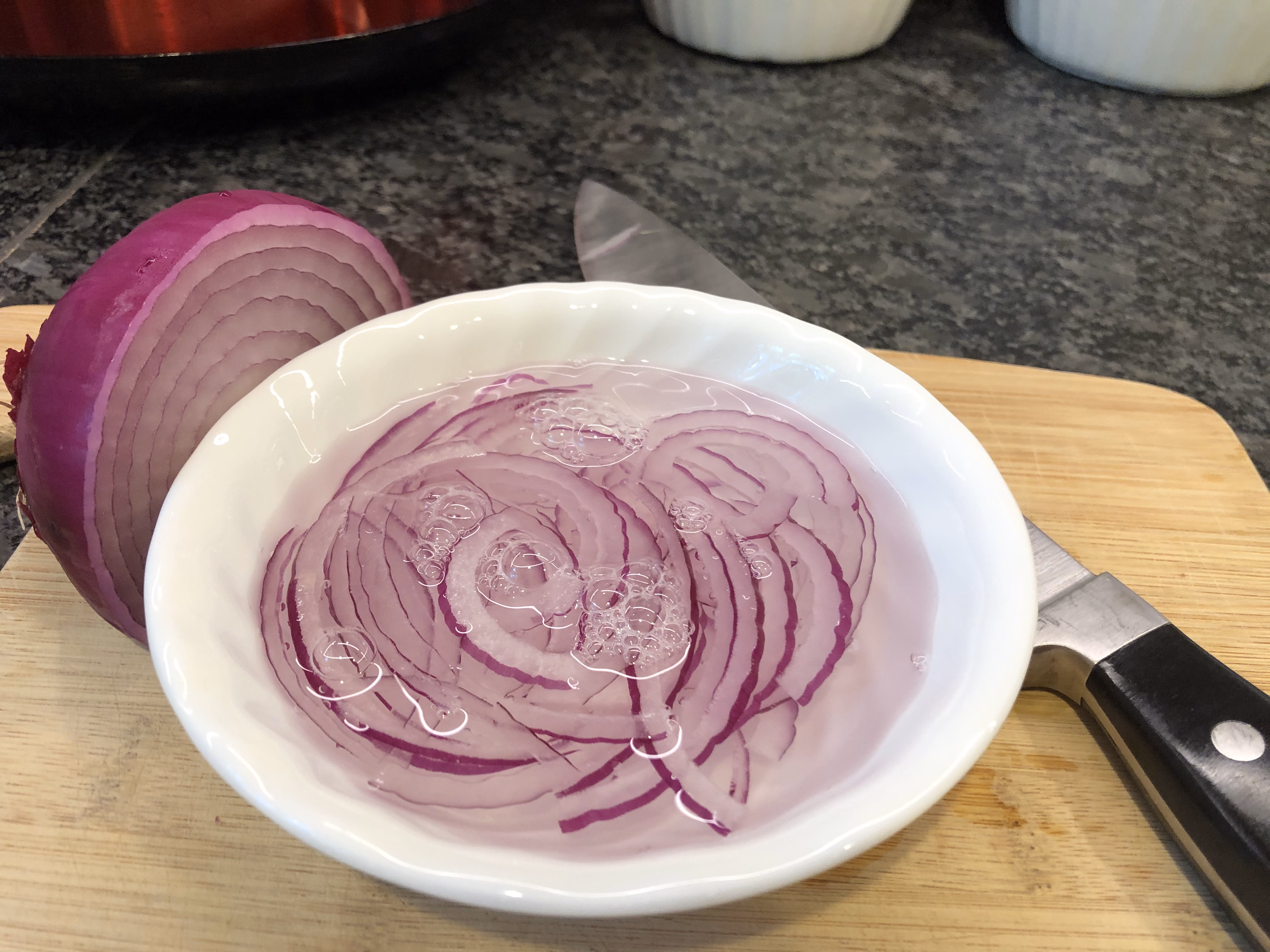 If you've been following other recipes of mine, you already know my trick with red onions. They have a bit of a bite, so if you take your sliced onions and soak them in cold water for about 5 minutes, then drain, they are just perfect! Flavor like you want without being too strong.