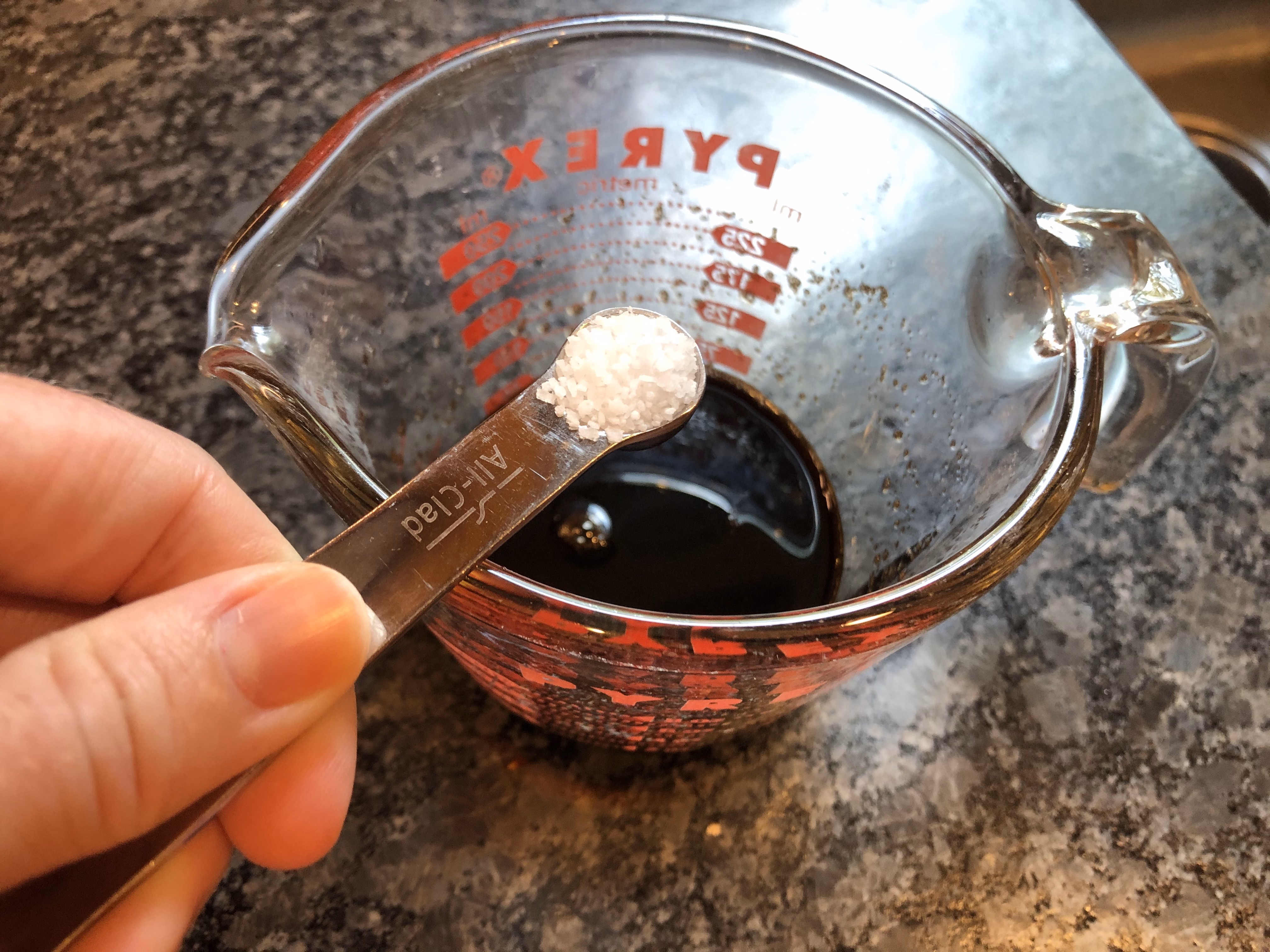 In a glass measuring cup, add 1/4 cup balsamic vinegar and 1 tablespoon honey. Microwave on high for a minute until it is thickened a bit. Add 1/4 teaspoon salt and stir. Set aside.
