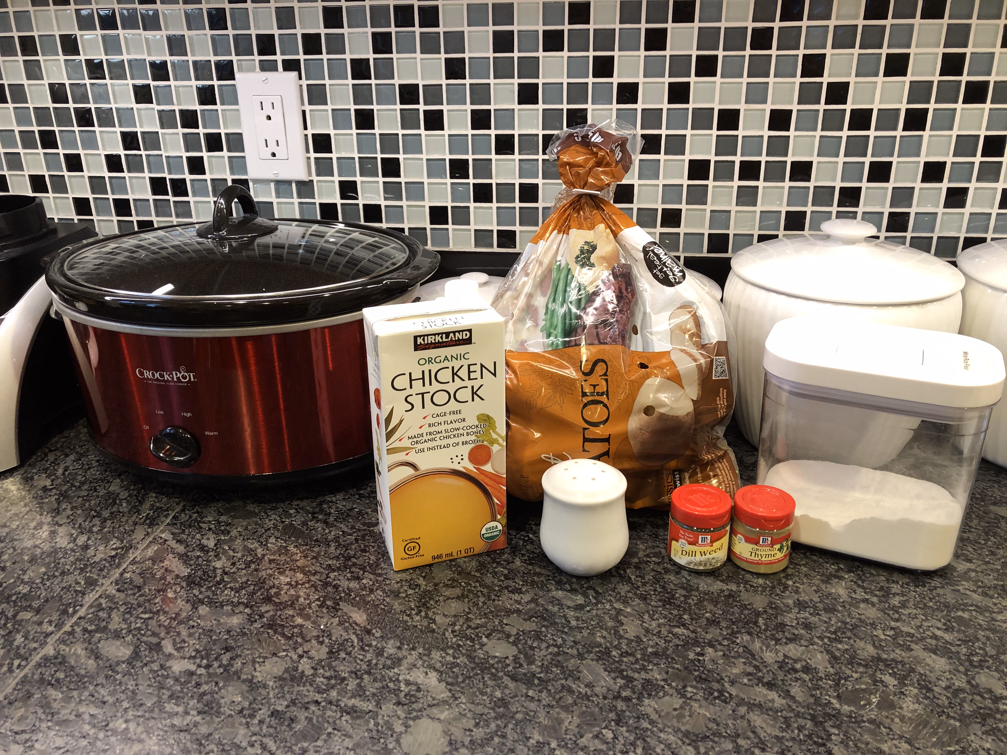 Peel and cut potatoes into cubes. Pour the chicken broth into the slow cooker followed by the seasonings and salt. In a separate bowl, whisk together the flour and water, then add to broth and stir to incorporate. Add the potatoes.