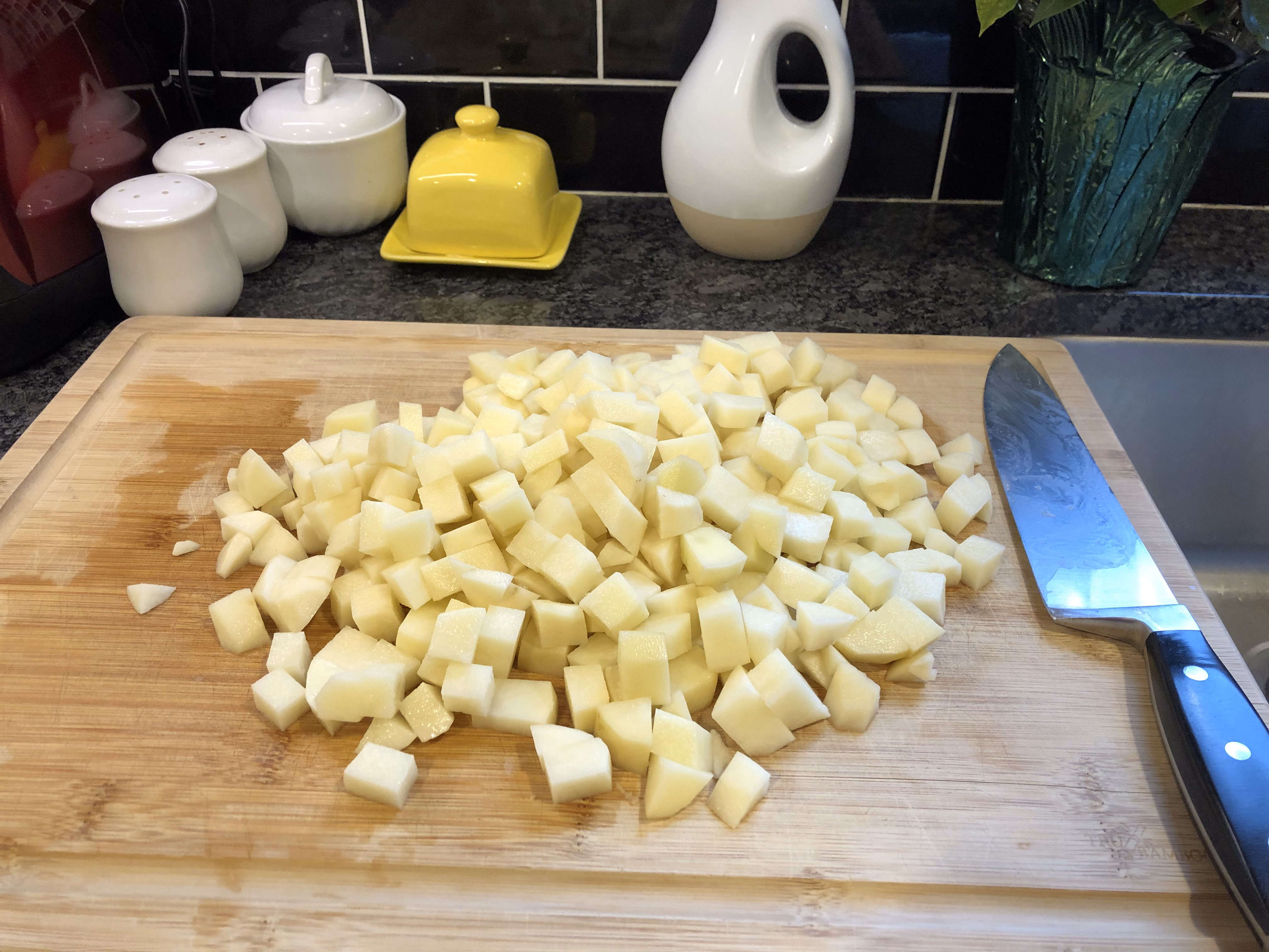Peel your and rinse your potatoes. Chop the potatoes into bite-size pieces.