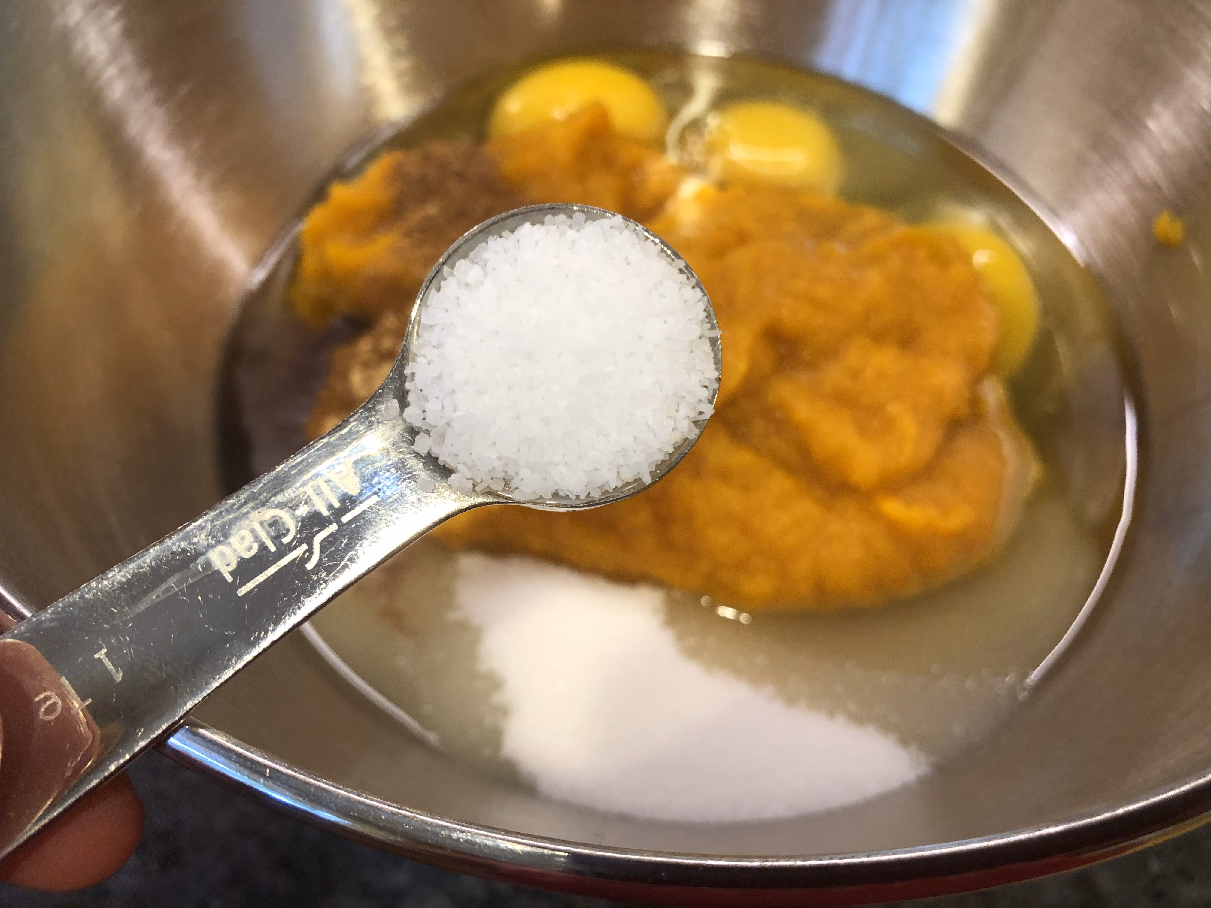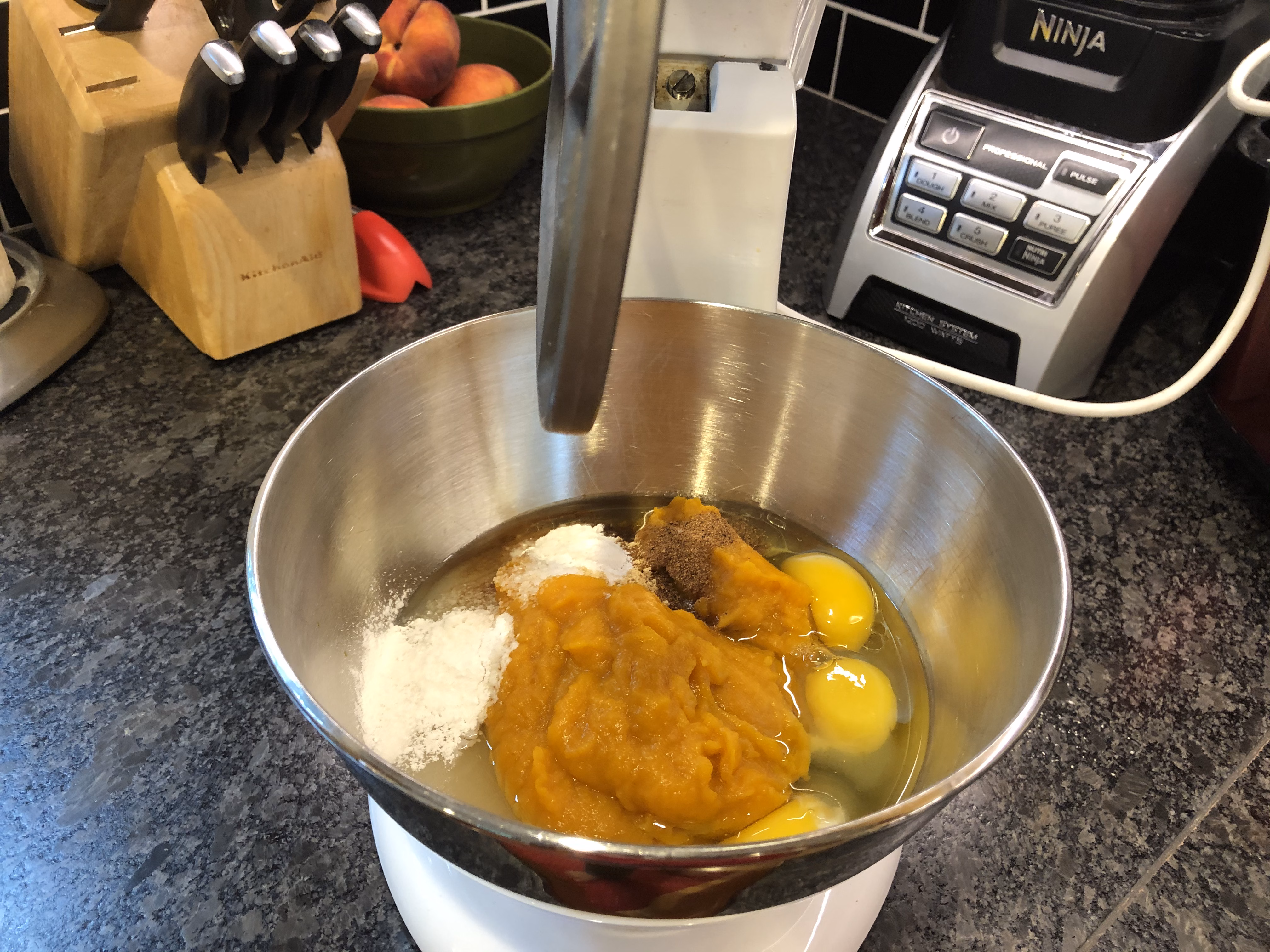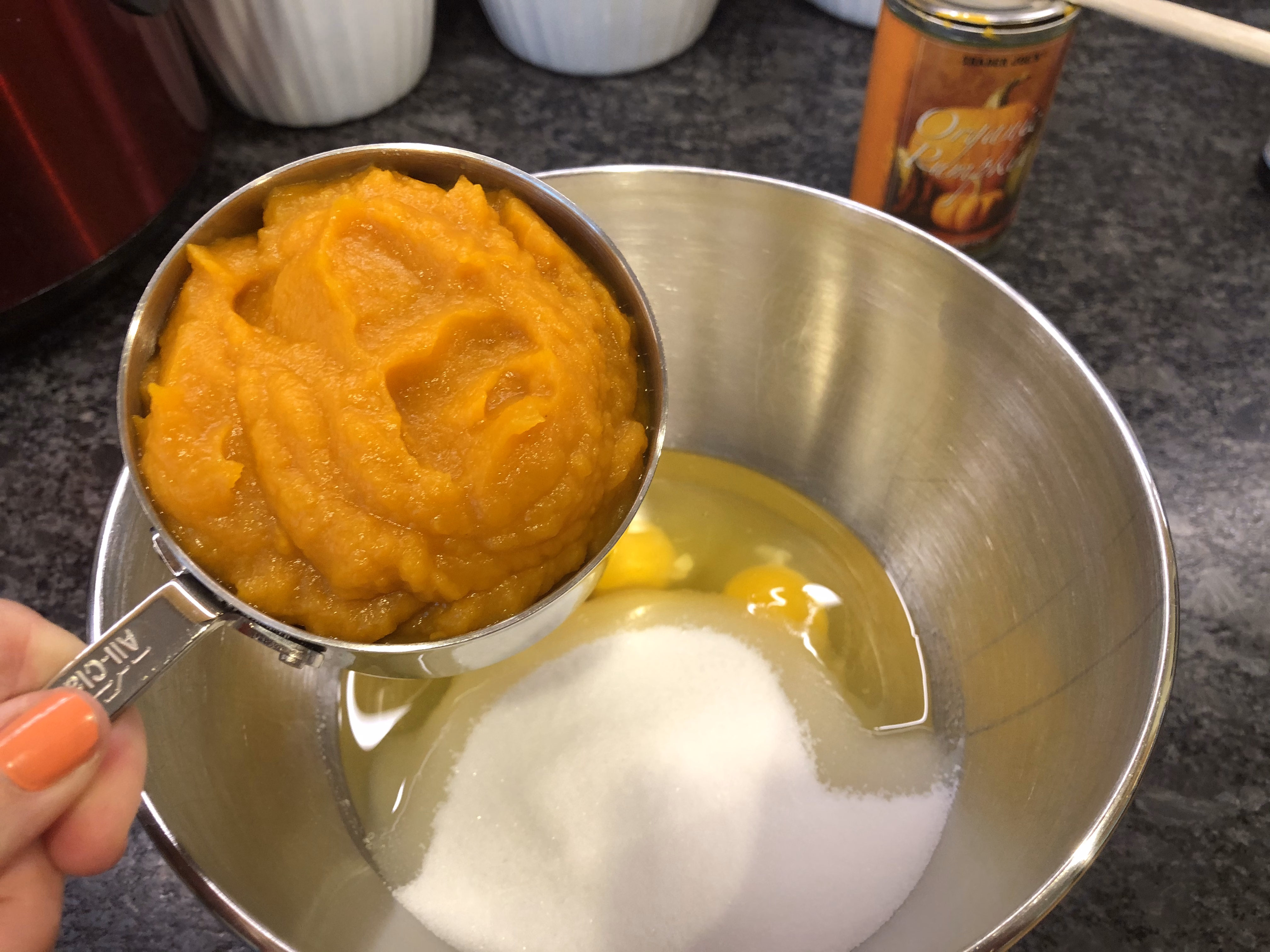 In a mixing bowl, add 3 large eggs, 1 1/2 cups sugar, 1 15-oz. can pumpkin puree, 1 1/4 teaspoons cinnamon.......