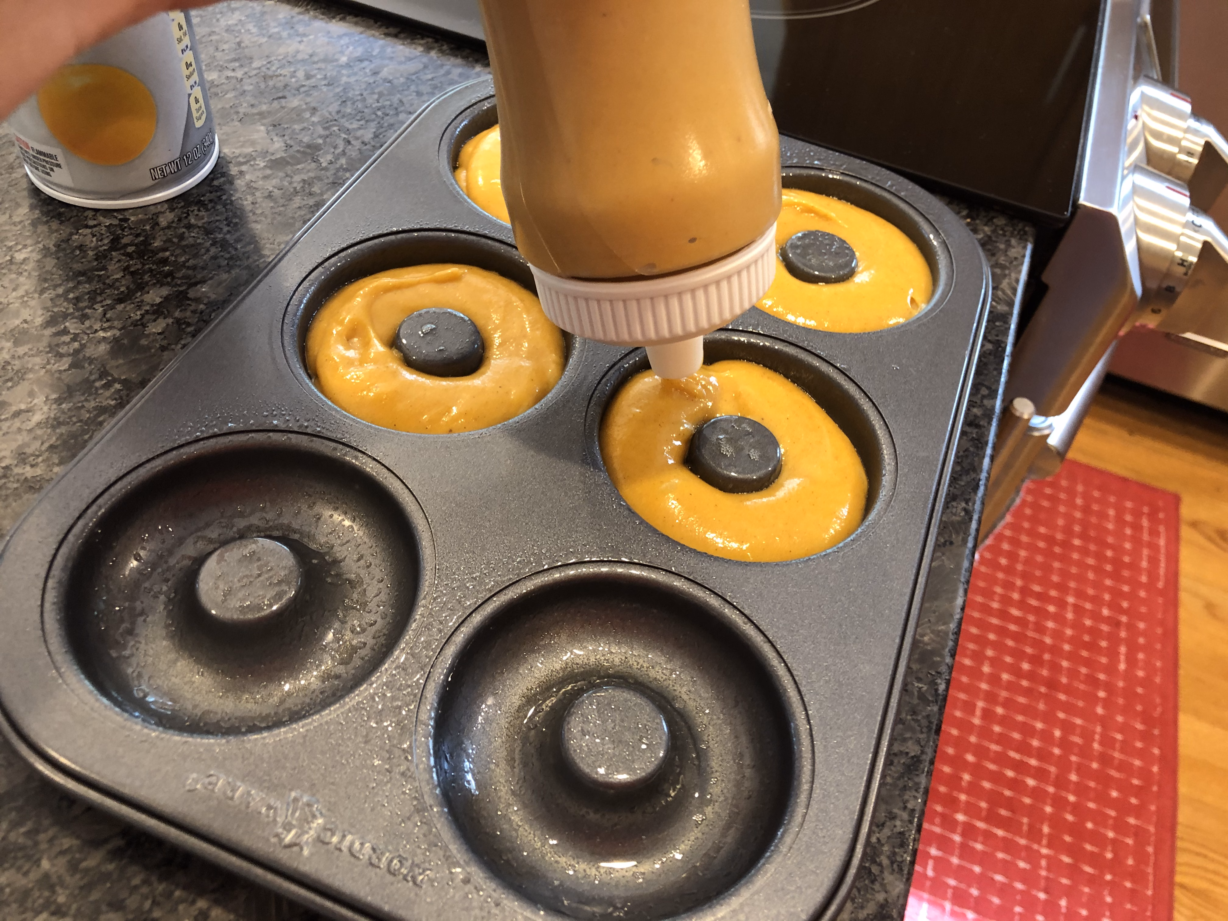 To make it really easy, I pour the donut batter into a pancake pen. This makes putting it into the greased donut pan super easy. Fill the donut pan about 3/4 full. Bake at 350°F for 15 minutes.