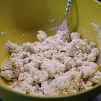 For the crust, in another bowl, combine 1 cup GF 1:1 flour and 2 teaspoons of baking powder. Cut in 1/2 cup spreadable plain cream cheese (so it's easy to stir) and using a pastry blender or fork, mix until it resembles coarse crumbs. Add 1/3 cup milk and use a fork to wet all the dry ingredients.