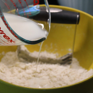 It should easily come into a ball when you pick it up with your hands. If it's still too dry, add a little more milk. If it's too sticky, add a little more flour. Divide the dough into 4 portions. Take each and roll into a ball, then flatten on a lightly floured surface to about 5 inches (or whatever diameter your bowls are). Place on top of the chicken mixture and prick several times with a fork.