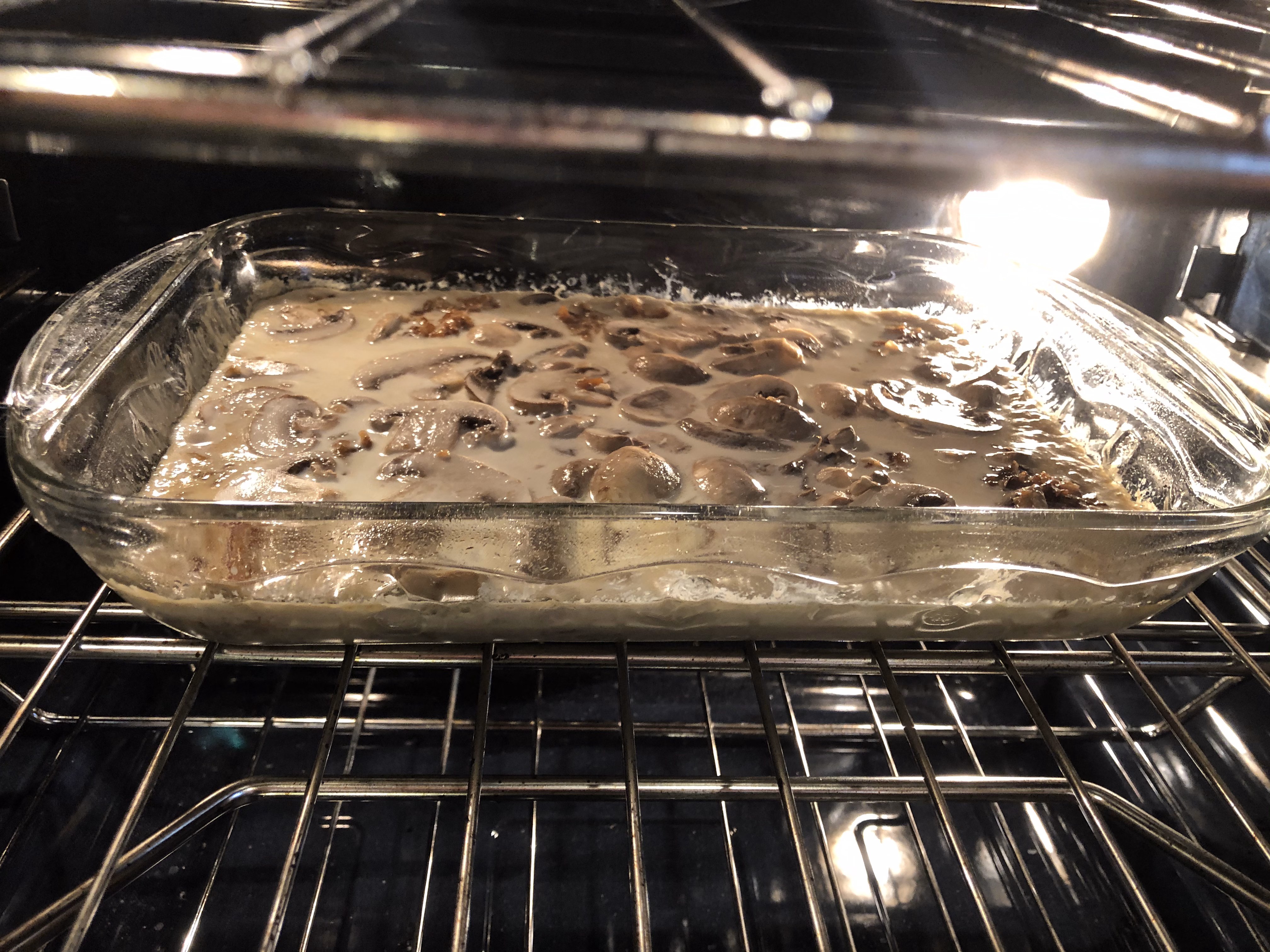 Remove and add 2 cups freshly sliced mushrooms. Stir the mushrooms into the cream. Recover with foil and bake 10 minutes.