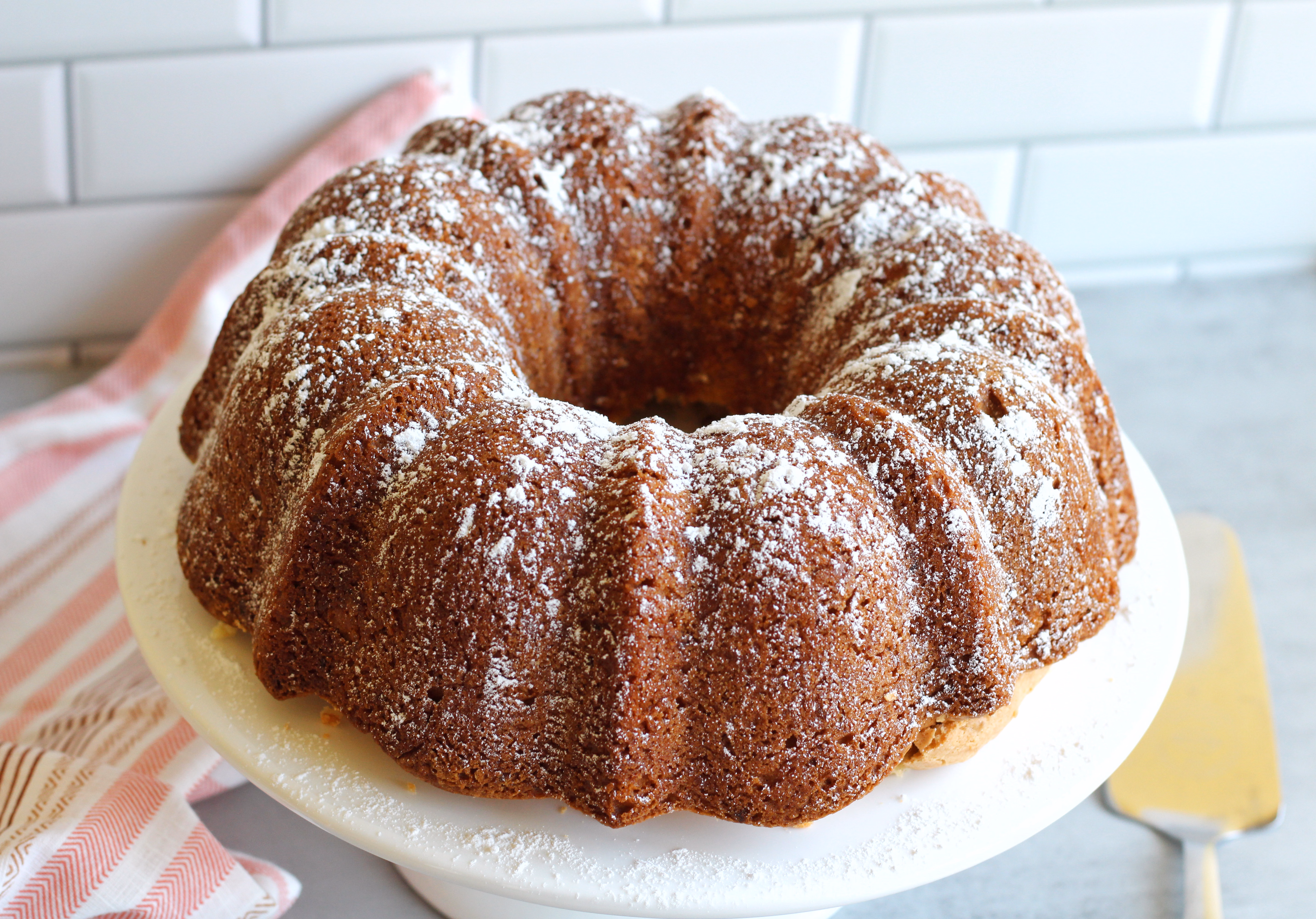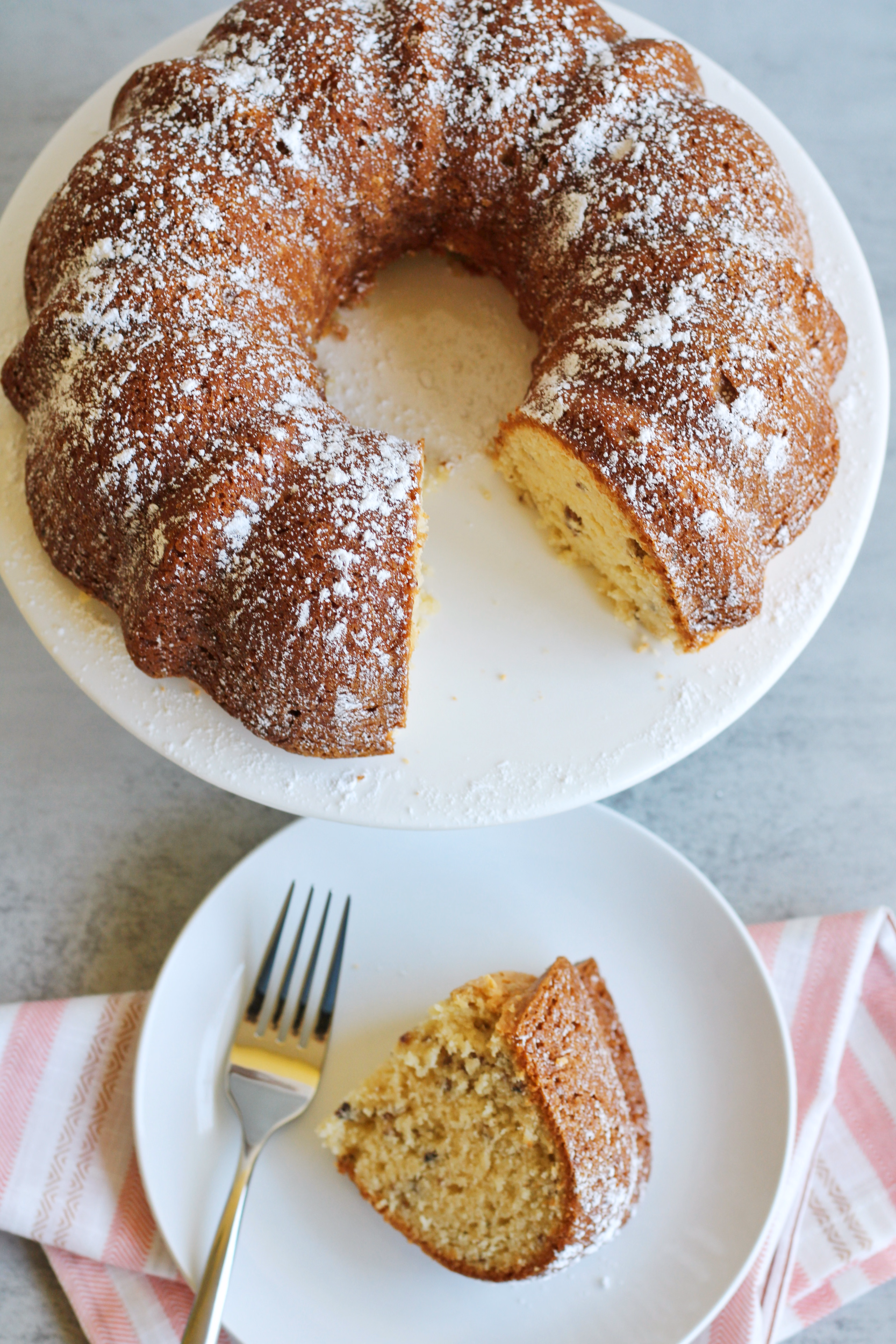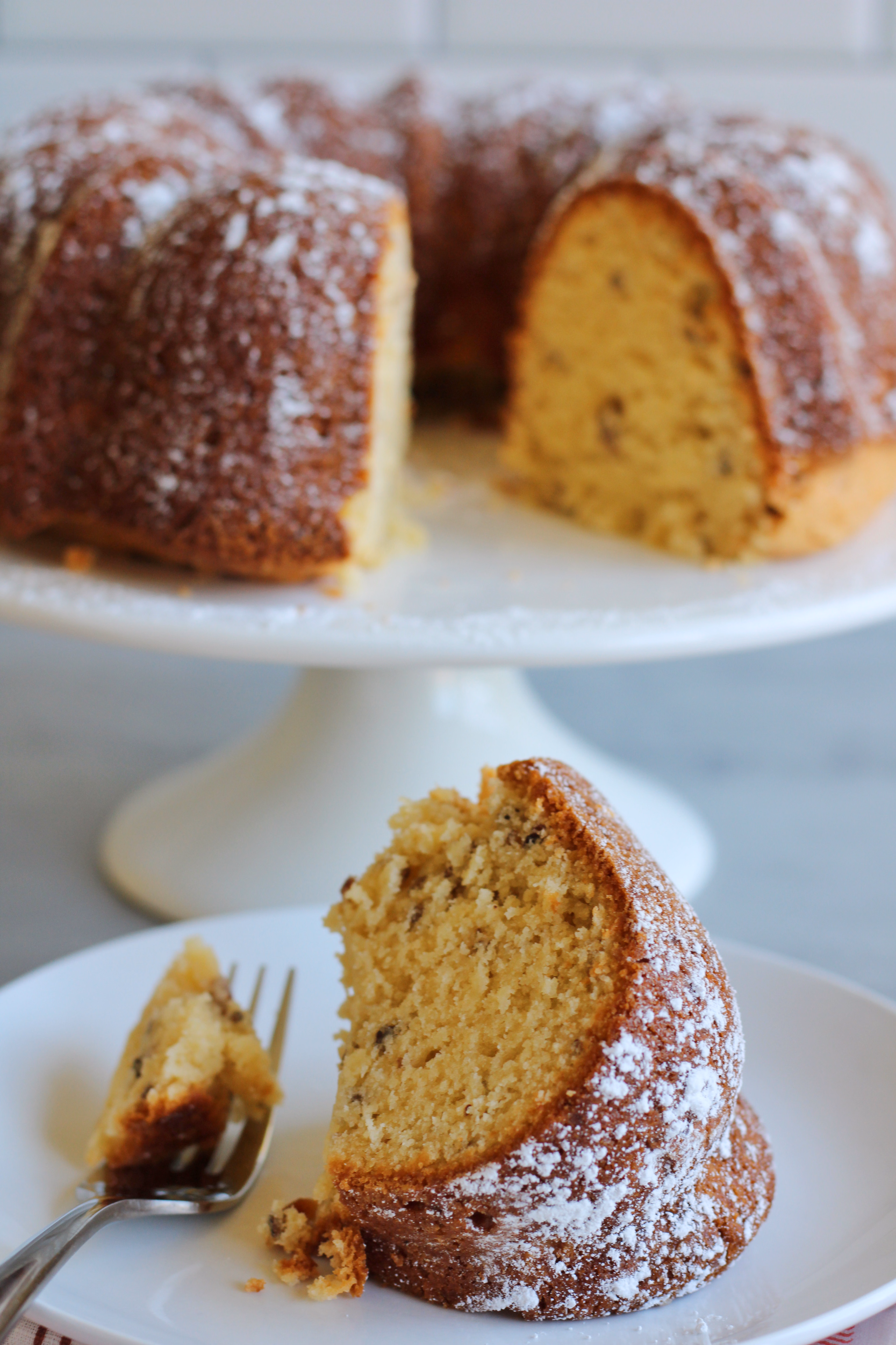Yes, I think brown sugar makes things taste amazing, and this cake is proof of that! A moist yellow bundt cake dressed up with vanilla pudding, sour cream, and brown sugar is what we have here. We like it with pecans, but I think mini chocolate chips would be good too. Top with powdered sugar and serve with vanilla ice cream for a special treat!