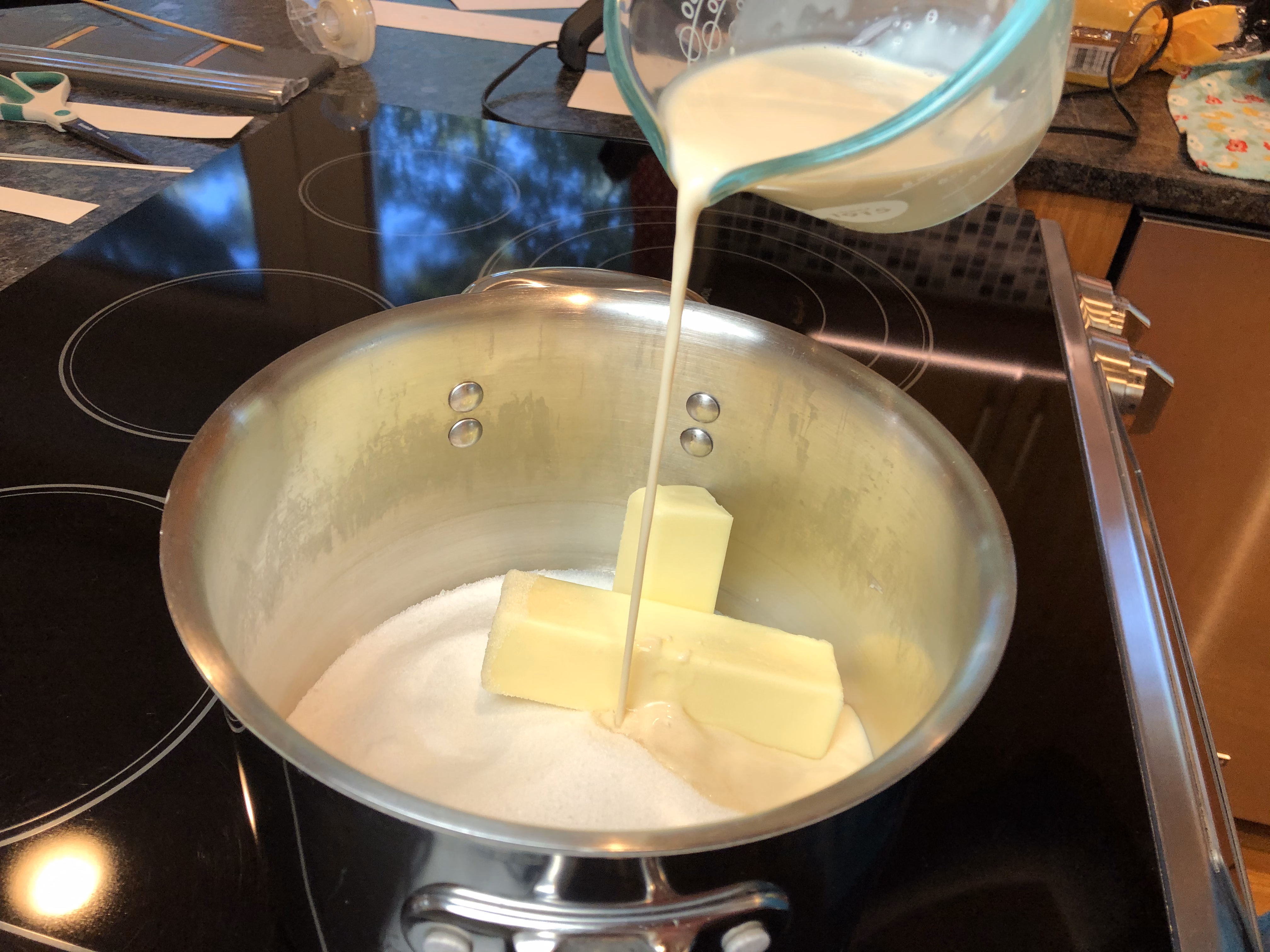 In a large saucepan, combine 2 cups sugar, 3/4 cup butter, and 1/2 cup evaporated milk.