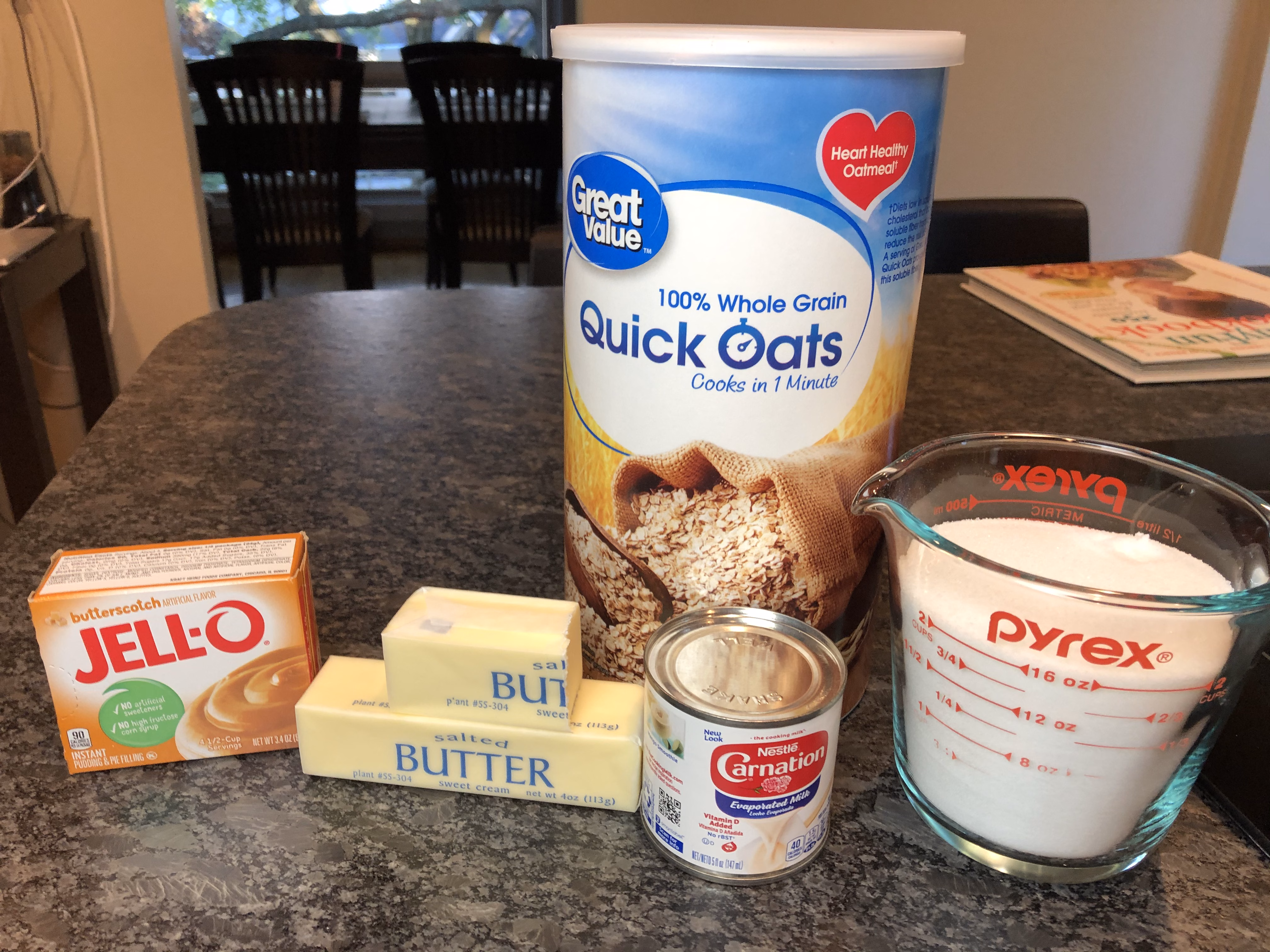Gather your ingredients. You will need butter, evaporated milk, sugar, butterscotch instant pudding, and quick oats.