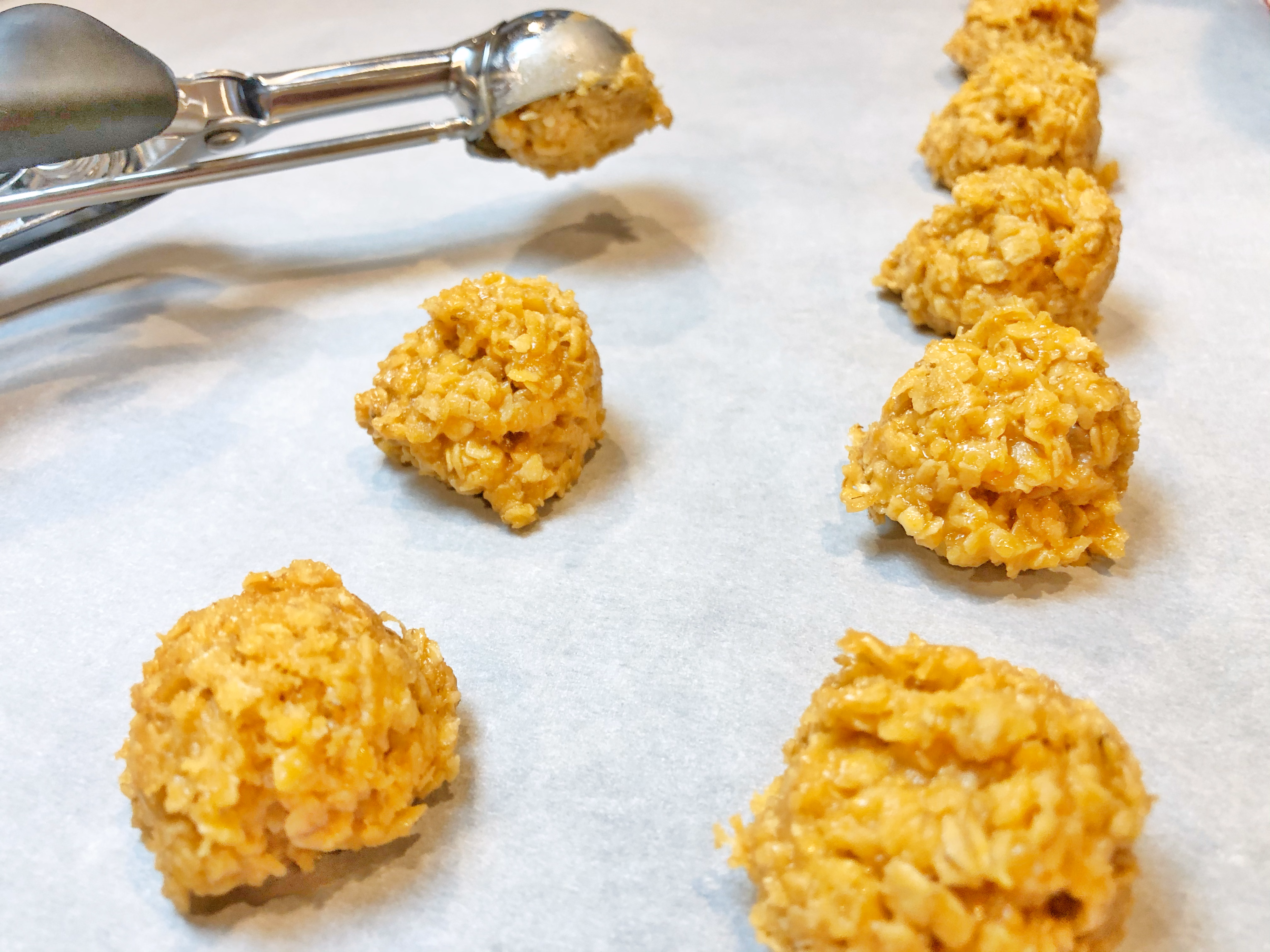 Using a miniature cookie scoop or a regular one for bigger cookies; drop warm cookies onto parchment paper.