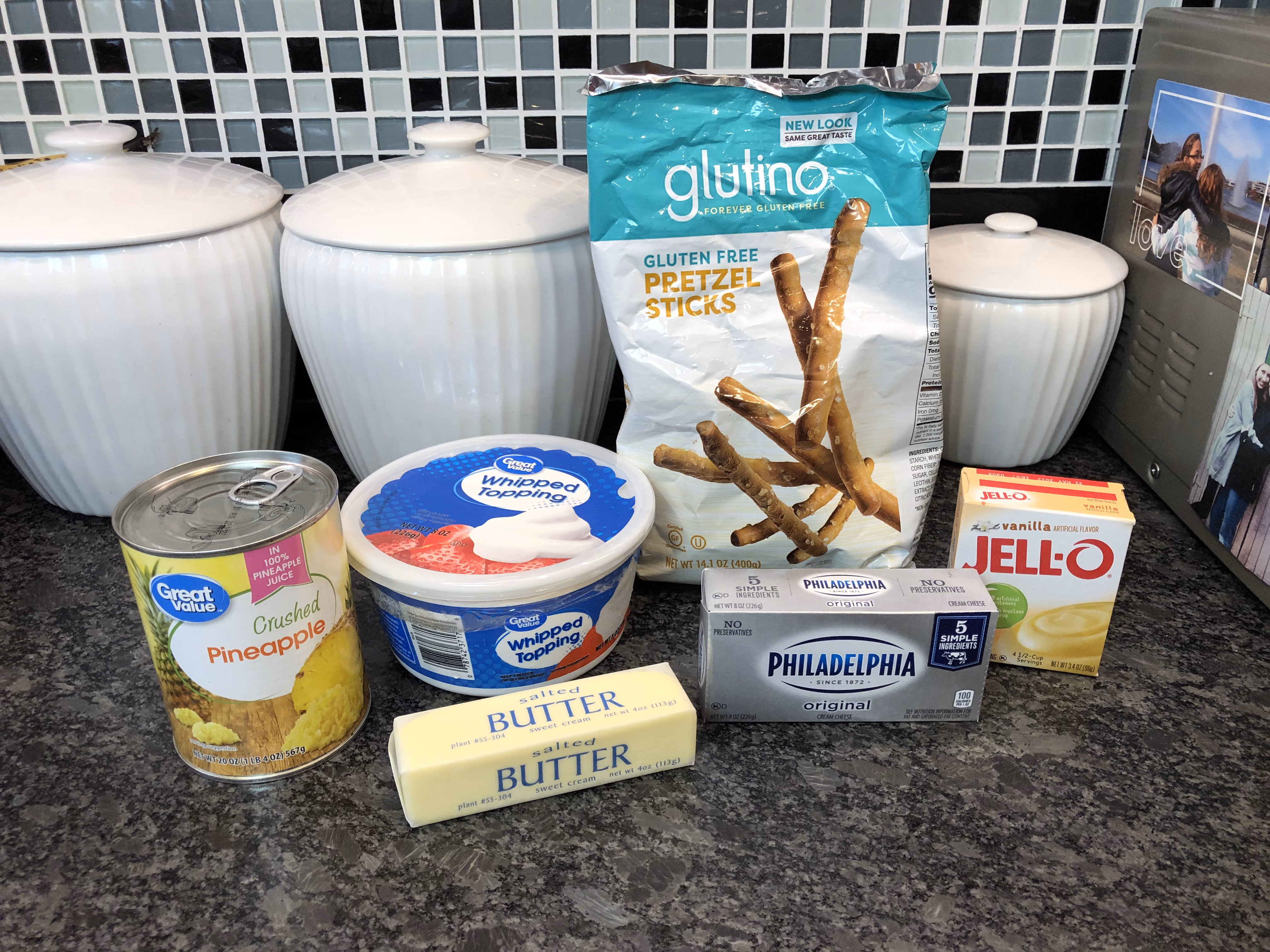 Gather your ingredients. You will need crushed pineapple, cream cheese, butter, whipped topping, gluten free pretzels, sugar, and instant vanilla pudding.