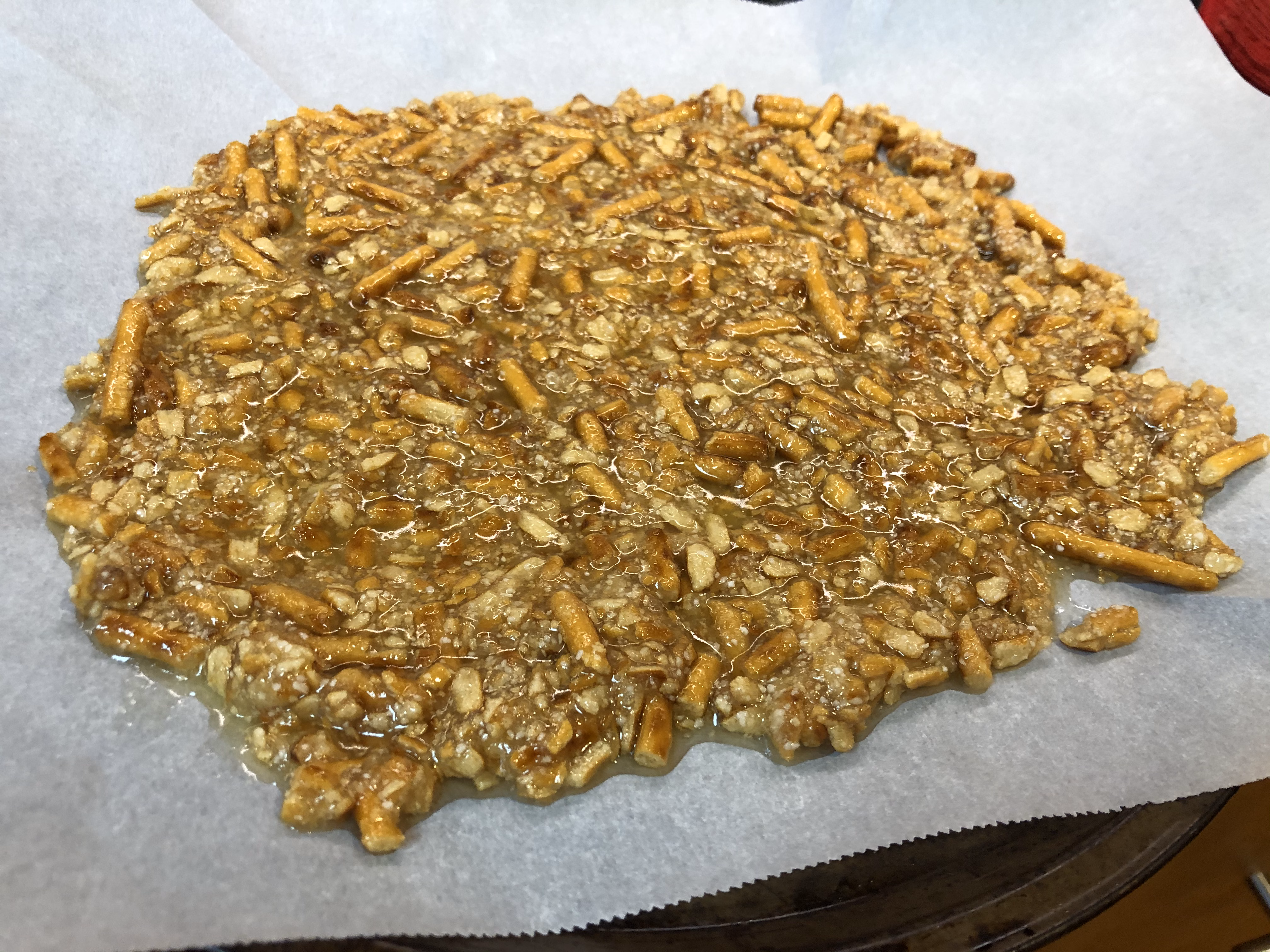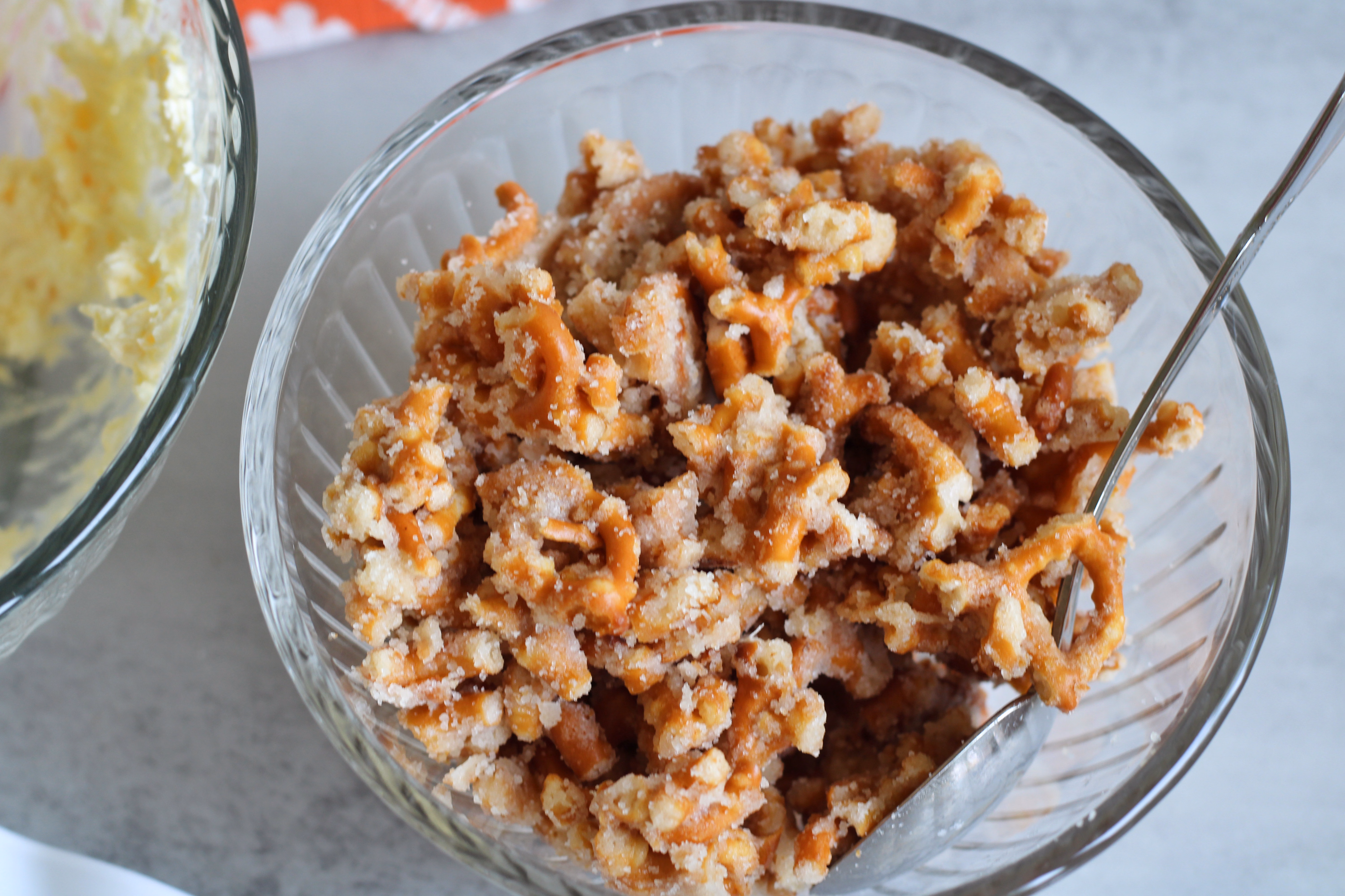 For sugared pretzels (totally addicting.... oh my! ) crush pretzels in a bag with a mallot. You will need 1 cup crushed pretzels. Melt 1/2 cup butter (1 stick) and stir in 1/2 cup sugar and crushed pretzels.