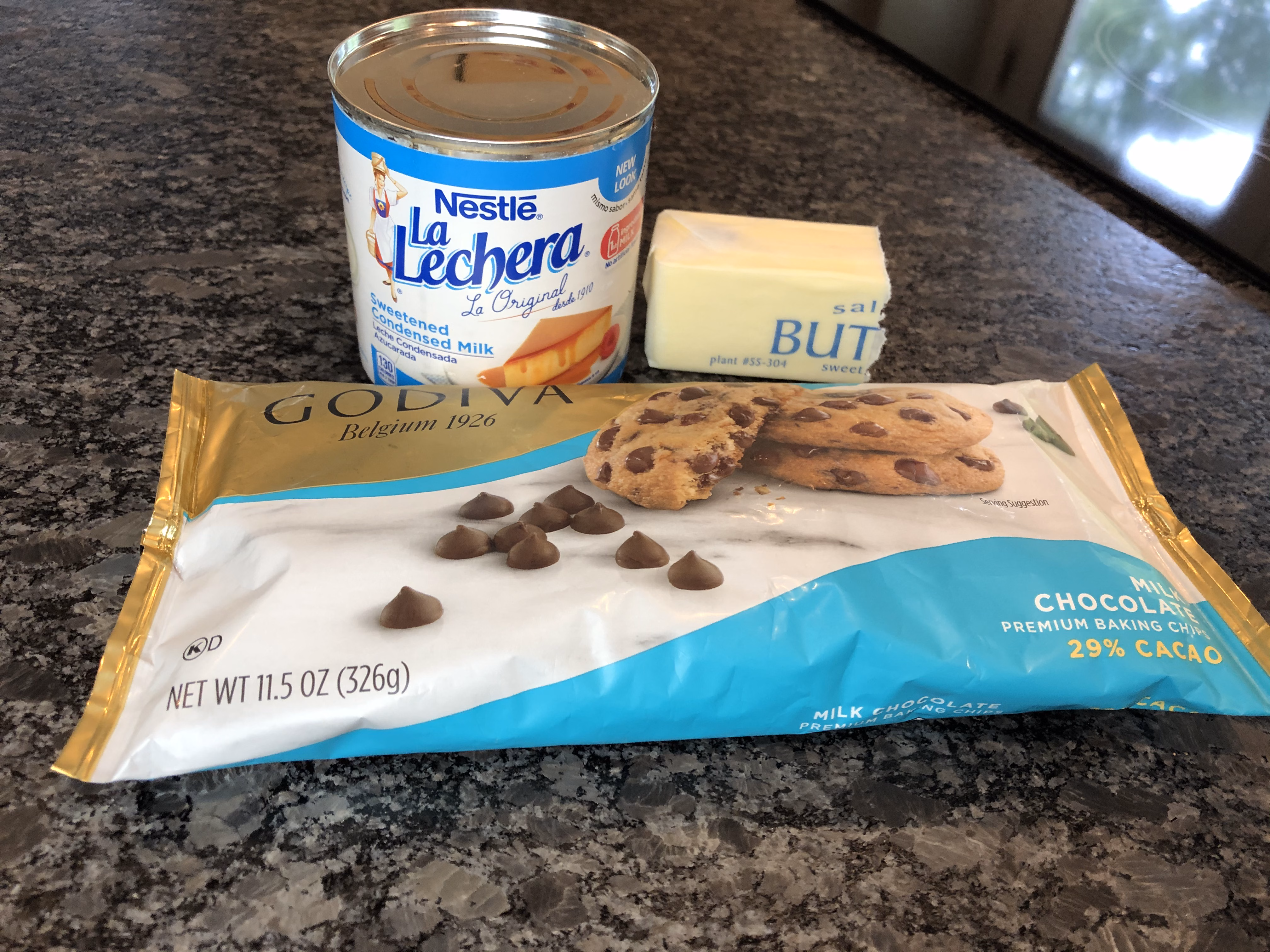 Gather your ingredients. You will need 1/4 cup butter, a can of sweetened condensed milk, and chocolate chips of choice. We mix this up depending on our mood. We love it made with dark, semi-sweet, or milk chips. You can also include a flavoring, if desired.