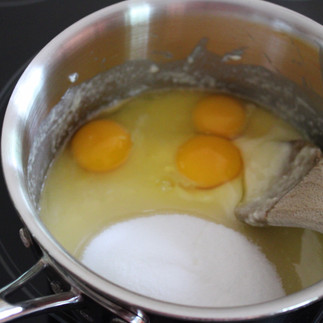 In a saucepan, melt the butter and white chocolate chips together over low heat, stirring frequently. Once melted, it won't be super smooth, and that's ok. Remove from the heat and add 3/4 cup sugar and 3 eggs. Stir until combined.